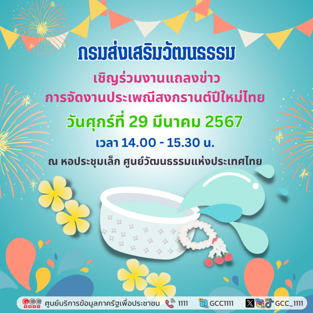 กรมส่งเสริมวัฒนธรรม เชิญร่วมงานแถลงข่าวการจัดงานประเพณีสงกรานต์ปีใหม่ไทย ในวันศุกร์ที่ 29 มีนาคม 2567 เวลา 14.00 – 15.30 น. ณ หอประชุมเล็ก ศูนย์วัฒนธรรมแห่งประเทศไทย