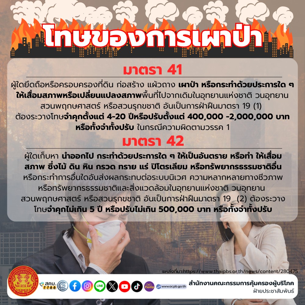 สำนักงานคณะกรรมการคุ้มครองผู้บริโภค แจ้งเตือนโทษของการเผาป่า ดังนี้ มาตรา 41 ผู้ใดยึดถือหรือครอบครองที่ดิน ก่อสร้าง แผ้วถาง เผาป่า หรือกระทําด้วยประการใด ๆ ให้เสื่อมสภาพหรือเปลี่ยนแปลงสภาพพื้นที่ไปจากเดิมในอุทยานแห่งชาติ วนอุทยานสวนพฤกษศาสตร์ หรือสวนรุกขชาติ อันเป็นการฝ่าฝืนมาตรา 19 (1) ต้องระวางโทษจําคุกตั้งแต่ 4-20 ปีหรือปรับตั้งแต่ 400,000 -2,000,000 บาท หรือทั้งจําทั้งปรับ ในกรณีความผิดตามวรรค 1 และ มาตรา 42 ผู้ใดเก็บหา นําออกไป กระทําด้วยประการใด ๆ ให้เป็นอันตราย หรือทํา ให้เสื่อม สภาพ ซึ่งไม้ ดิน หิน กรวด ทราย แร่ ปิโตรเลียม หรือทรัพยากรธรรมชาติอื่น หรือกระทําการอื่นใดอันส่งผลกระทบต่อระบบนิเวศ ความหลากหลายทางชีวภาพ หรือทรัพยากรธรรมชาติและสิ่งแวดล้อมในอุทยานแห่งชาติ วนอุทยาน สวนพฤกษศาสตร์ หรือสวนรุกขชาติ อันเป็นการฝ่าฝืนมาตรา 19 (2) ต้องระวาง โทษจําคุกไม่เกิน 5 ปี หรือปรับไม่เกิน 500,000 บาท หรือทั้งจําทั้งปรับ