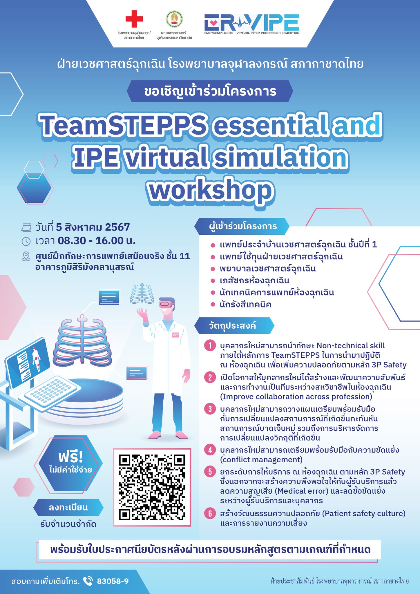 โรงพยาบาลจุฬาลงกรณ์ จัดโครงการ TeamSTEPPS essential and IPE virtual simulation workshop ในวันที่ 5 สิงหาคม 2567 เวลา 08.30 – 16.00 น. ณ ศูนย์ฝึกทักษะการแพทย์เสมือนจริง ชั้น 11 อาคารภูมิสิริมังคลานุสรณ์ โดยไม่มีค่าใช้จ่าย ไม่จำนวนจำกัด