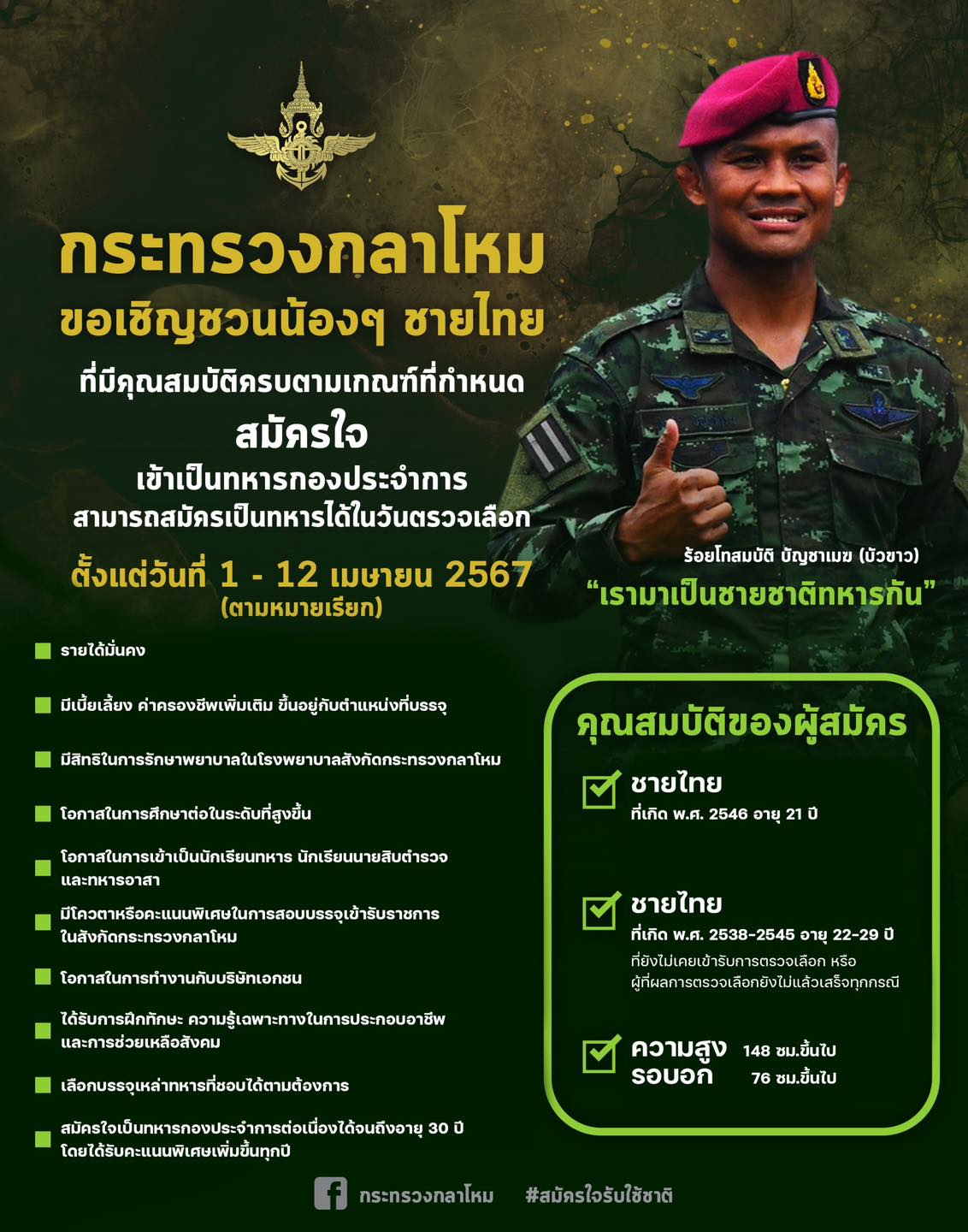 กระทรวงกลาโหม ขอเชิญชวนชายไทย ที่มีคุณสมบัติครบตามเกณฑ์ที่กำหนด สมัครใจรับใช้ชาติ