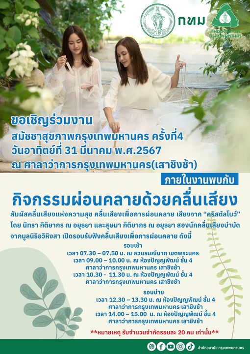 - สำนักอนามัย เชิญร่วม “กิจกรรมผ่อนคลายด้วยคลื่นเสียง” ในงานสมัชชาสุขภาพกรุงเทพมหานคร ครั้งที่ 4