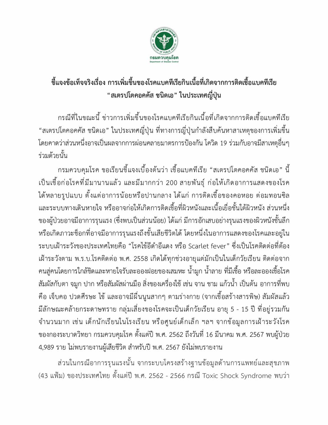 กรมควบคุมโรค ชี้แจงข้อเท็จจริงเรื่อง การเพิ่มขึ้นของโรคแบคทีเรียกินเนื้อที่เกิดจากการติดเชื้อแบคทีเรีย “สเตรปโตคอคคัส ชนิดเอ” ในประเทศญี่ปุ่นจากกรณีได้มีข่าวการเพิ่มขึ้นของโรคแบคทีเรียกินเนื้อที่เกิดจากการติดเชื้อแบคทีเรีย “สเตรปโตคอคคัส ชนิดเอ” ในประเทศญี่ปุ่น ที่ทางการญี่ปุ่นกําลังสืบค้นหาสาเหตุของการเพิ่มขึ้น โดยคาดว่าส่วนหนึ่งอาจเป็นผลจากการผ่อนคลายมาตรการป้องกัน โควิด 19 ร่วมกับอาจมีสาเหตุอื่นๆ ร่วมด้วยนั้น