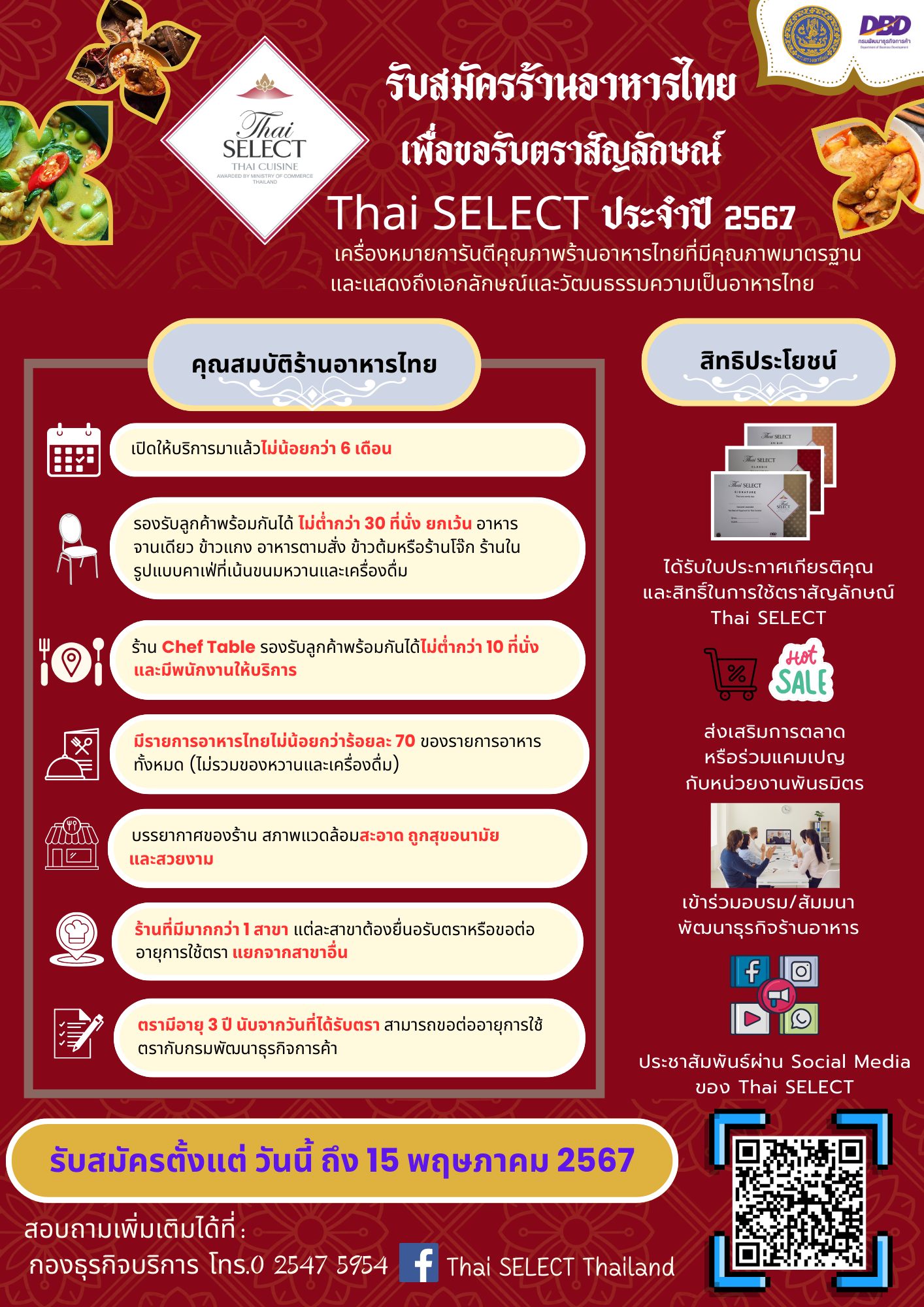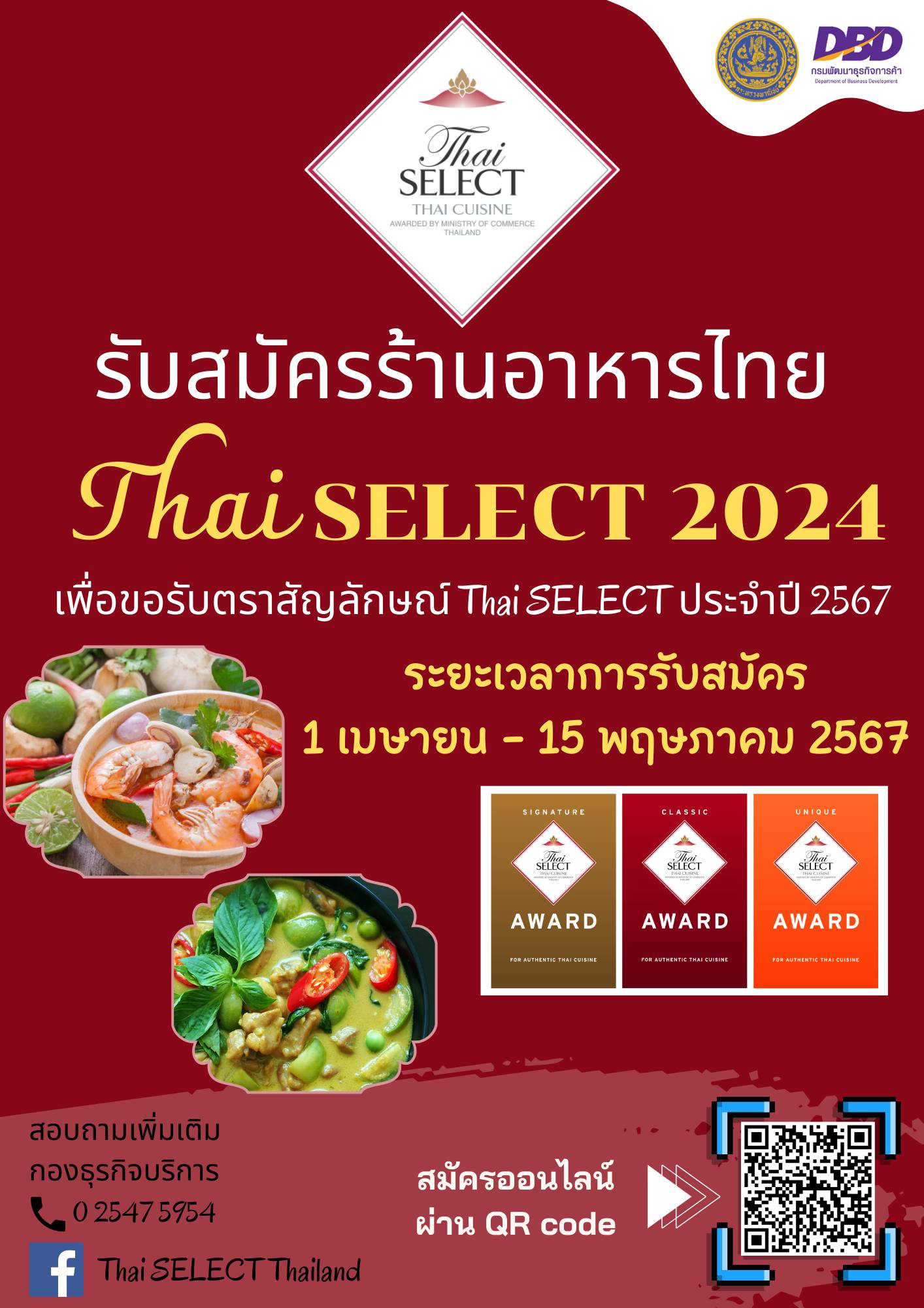 กรมพัฒนาธุรกิจการค้า เปิดรับสมัครร้านอาหารไทย เพื่อขอรับตราสัญลักษณ์ Thai SELECT ประจำปี 2567 เปิดรับสมัครตั้งแต่วันที่ 1 เมษายน – 15 พฤษภาคม 2567