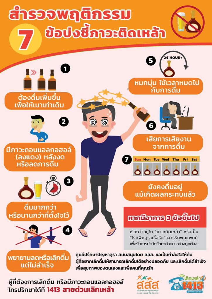 สำนักงานกองทุนสนับสนุนการสร้างเสริมสุขภาพ แนะนำสำรวจพฤติกรรม 7 ข้อบ่งชี้ภาวะติดเหล้า หากมีอาการ 8 ข้อขึ้นไป เรียกว่าอยู่ใน “ภาวะติดเหล้า” หรือเป็น “โรคพิษสุราเรื้อรัง” ควรรีบพบแพทย์ เพื่อรับการบําบัดรักษาด้วยยาอย่างถูกต้อง ผู้ที่ต้องการเลิกดื่ม หรือมีภาวะถอนแอลกอฮอล์ สามารถโทรปรึกษาได้ที่ หมายเลขโทรศัพท์ 1413 สายด่วนเลิกเหล้า