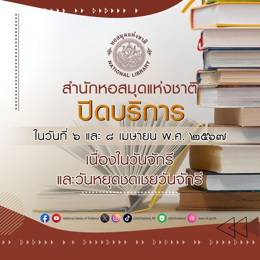 สำนักหอสมุดแห่งชาติ แจ้งปิดการให้บริการ วันที่ 6 และ 8 เมษายน 2567 เนื่องในวันจักรีและวันหยุดชดเชยวันจักรี