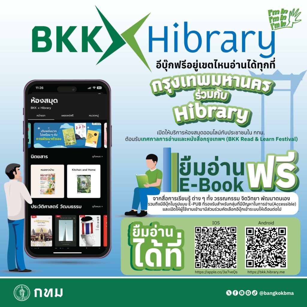 BKK X Hibrary ห้องสมุดออนไลน์ (e-Library) บริการดี ๆ จาก กทม. เพื่อนักอ่านทุกท่าน กทม. ให้บริการหนังสือในรูปแบบอีบุ๊ค ฟรี อ่านได้ทุกที่ไม่ว่าคุณจะอยู่ที่ไหน ดาวน์โหลดแอปพลิเคชัน Hibrary โดยสามารถสแกนคิวอาร์โค้ด เพื่อดาวน์โหลดแอปพลิเคชันทั้งระบบ iOS และแอนดรอยด์ หรือเข้าผ่านเว็บไซต์ bkk.hibrary.me เพียงเท่านี้ คุณก็จะได้อ่าน E-Book แบบถูกลิขสิทธิ์ ฟรี