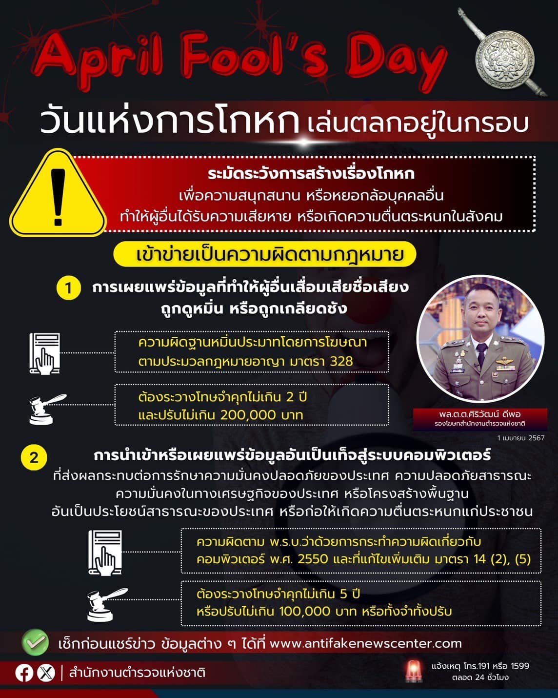สำนักงานตำรวจแห่งชาติ เตือน “วันแห่งการโกหก” เล่นตลกอยู่ในกรอบ ทุกคนไม่ได้ชอบ อาจถูกฟ้องดำเนินคดี