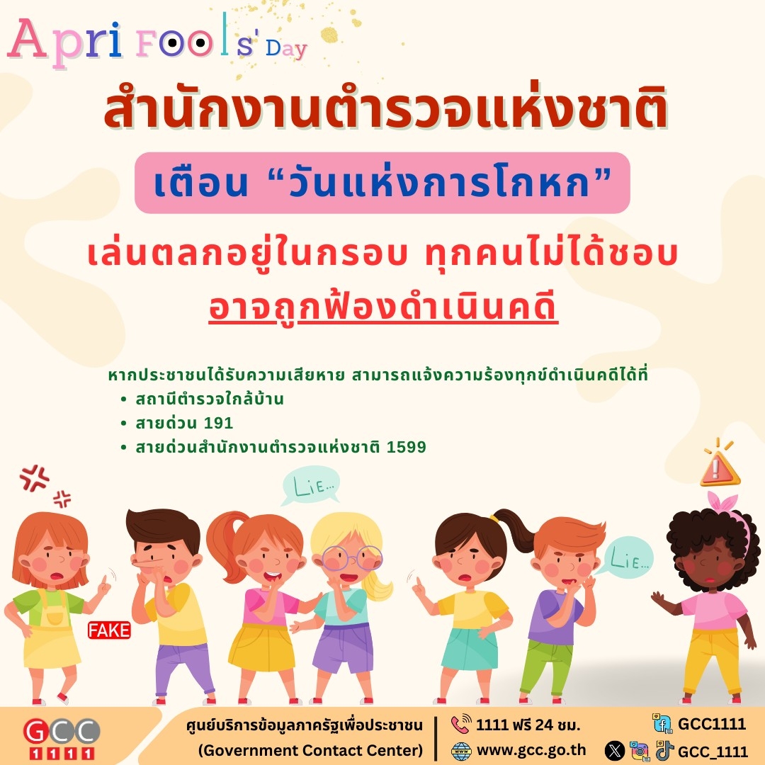 สำนักงานตำรวจแห่งชาติ เตือน “วันแห่งการโกหก” เล่นตลกอยู่ในกรอบ ทุกคนไม่ได้ชอบ อาจถูกฟ้องดำเนินคดี พร้อมแนะนำหากประชาชนได้รับความเสียหาย หรือพบเห็นบุคคลใดสร้างข่าวปลอมจนทำให้เกิดความสับสนในสังคม สามารถแจ้งความร้องทุกข์ดำเนินคดีได้ที่สถานีตำรวจใกล้บ้านท่าน หรือแจ้งเบาะแสไปยังสายด่วน 191 และสายด่วนสำนักงานตำรวจแห่งชาติ 1599 ได้ตลอด 24 ชั่วโมง