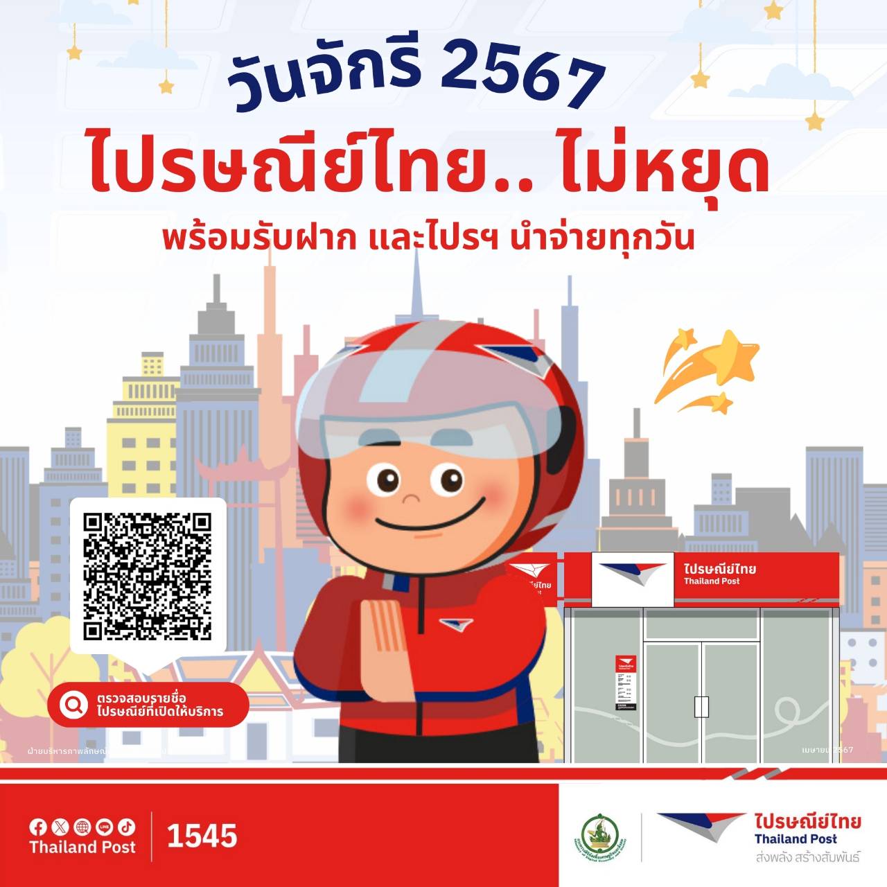 บริษัท ไปรษณีย์ไทย จำกัด แจ้งเปิดให้บริการ ในวันจักรี 6 เมษายน 2567 และวันหยุดชดเชยวันจักรี 8 เมษายน 2567