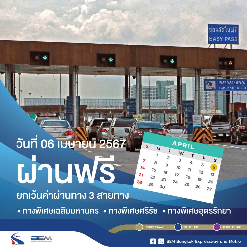 การทางพิเศษแห่งประเทศไทย ยกเว้นค่าผ่านทาง 3 เส้นทาง วันที่ 6 เมษายน 2567