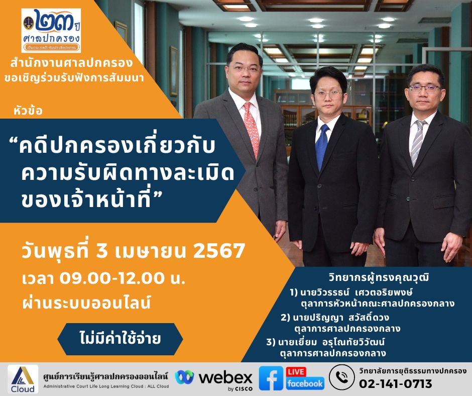 สำนักงานศาลปกครอง ขอเชิญร่วมรับฟังการสัมมนาภายใต้โครงการเสริมสร้างธรรมาภิบาลสู่สังคม ประจำปีงบประมาณ พ.ศ. 2567 (ฟรีไม่มีค่าใช้จ่าย) การสัมมนาหัวข้อ “คดีปกครองเกี่ยวกับความรับผิดทางละเมิดของเจ้าหน้าที่” วันพุธที่ 3 เมษายน 2567 เวลา 09.00 – 12.00 น.
