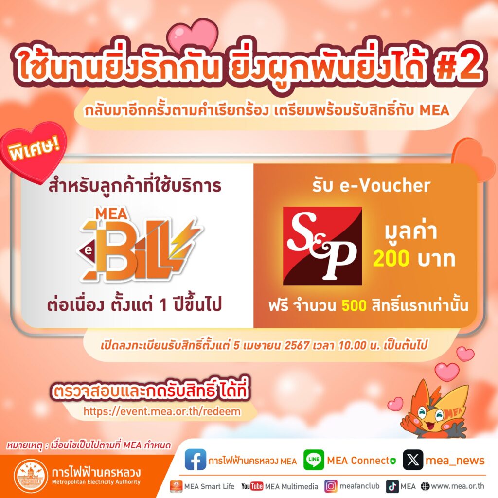 การไฟฟ้านครหลวง มอบของขวัญ สำหรับลูกค้าที่ใช้บริการ MEA e-Bill ต่อเนื่อง ตั้งแต่ 1 ปีขึ้นไป รับ e-Voucher S&P มูลค่า 200 บาท ฟรี จำนวน 500 สิทธิ์แรก เท่านั้น เปิดลงทะเบียนรับสิทธิ์ตั้งแต่ 5 เมษายน 2567 เวลา 10.00 น. เป็นต้นไป จนกว่าจะครบตามจำนวนที่ MEA กำหนด ตรวจสอบและกดรับสิทธิ์ ได้ที่ https://event.mea.or.th/redeem