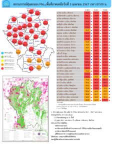 ศูนย์แก้ไขปัญหามลพิษทางอากาศ รายงานการติดตามตรวจสอบคุณภาพอากาศ ประจำวันที่ 3 เมษายน 2567 เวลา 07.00 น. สรุปดังนี้