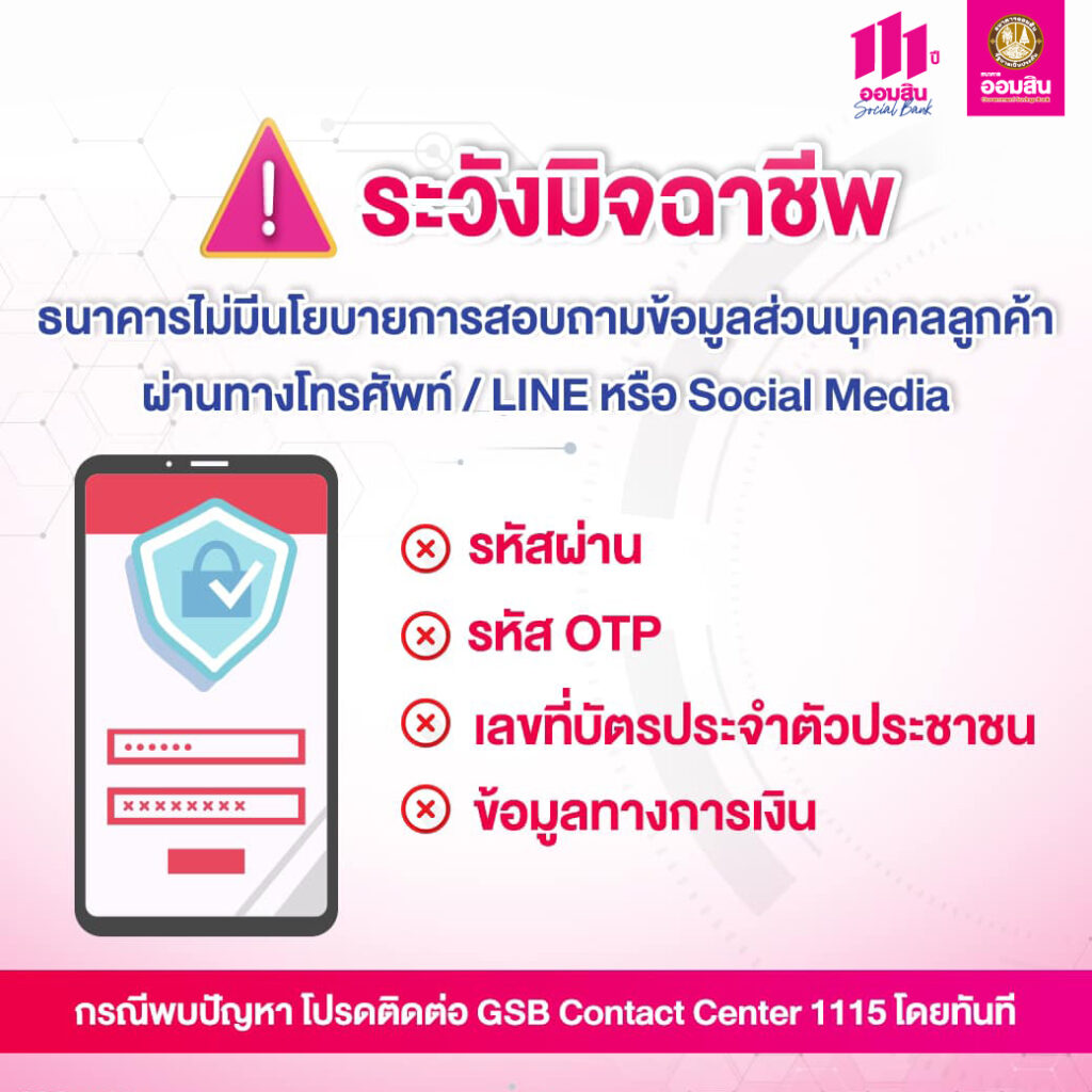 - หากพบกรณีดังกล่าว โปรดติดต่อ GSB Contact Center 1115 หรือแจ้งผ่าน Facebook: GSB Society โดยทันที