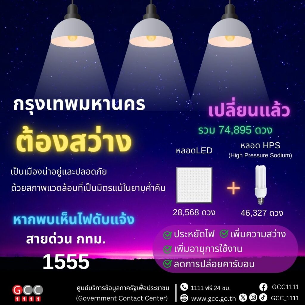 กทม. ดำเนินการเปลี่ยนหลอดไฟเป็น LED และ หลอดระบบ HPS กว่า 7 หมื่นดวง เพื่อความปลอดภัยของประชาชน
