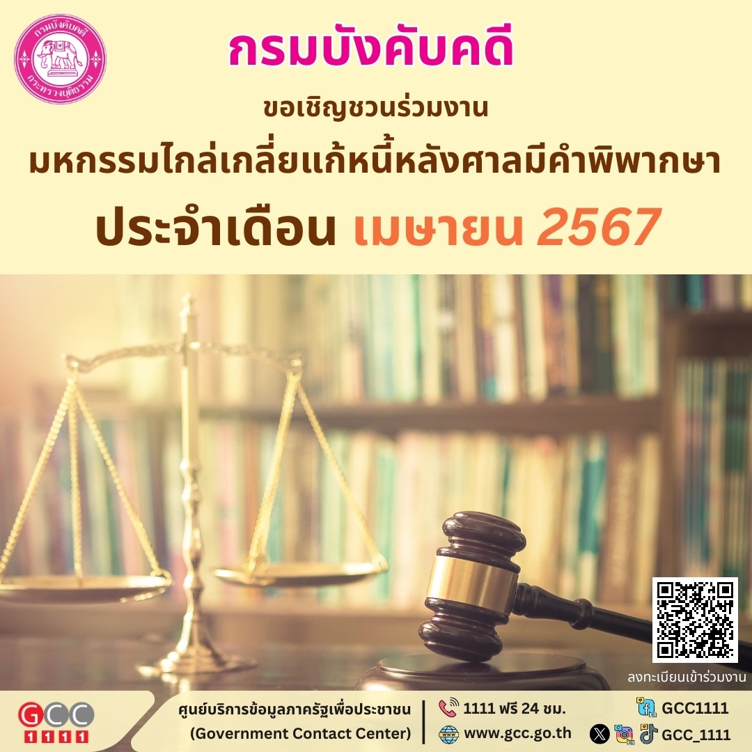 กรมบังคับคดี ขอเชิญชวนร่วมงานมหกรรมไกล่เกลี่ยแก้หนี้หลังศาลมีคำพิพากษา ประจำเดือนเมษายน 2567