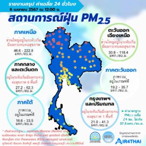 ศูนย์แก้ไขปัญหามลพิษทางอากาศ รายงานการติดตามตรวจสอบคุณภาพอากาศ ประจำวันที่ 6 เมษายน 2567 เวลา 12.00 น. สรุปดังนี้