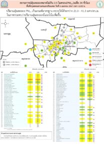 - กรุงเทพมหานครและปริมณฑล เกินค่ามาตรฐาน 1 พื้นที่ ตรวจวัดได้ 21.0 – 41.3 ไมโครกรัมต่อลูกบาศก์เมตร