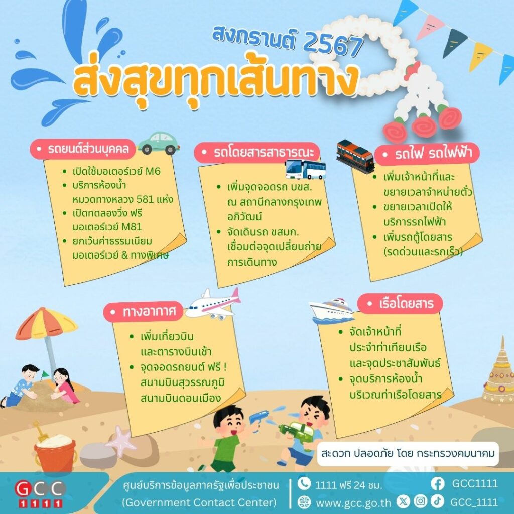 กระทรวงคมนาคม พร้อมอำนวยความสะดวกและความปลอดภัยในการเดินทางช่วงเทศกาลสงกรานต์ 2567 ระหว่างวันที่ 11 – 17 เมษายน 2567 “เดินทางทั่วไทย คมนาคม สะดวก ปลอดภัย ใส่ใจให้บริการประชาชน” เดินทางกลับภูมิลำเนาและท่องเที่ยว ด้วยความสุขทุกเส้นทาง ทั้งนี้ สอบถามข้อมูลข่าวสารการเดินทางและเรื่องร้องเรียน ได้ที่