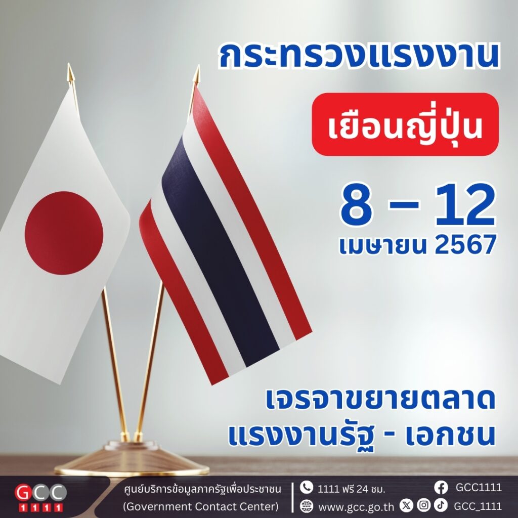 กระทรวงแรงงาน เยือนประเทศญี่ปุ่น เพื่อกระชับความสัมพันธ์ระหว่างรัฐบาลไทย – ญี่ปุ่น สร้างความเชื่อมั่นและเพิ่มแรงจูงใจในการจ้างแรงงานไทย ระหว่างวันที่ 8 – 12 เมษายน 2567 โดยประเด็นหารือสำคัญ จะมุ่งไปที่การขยายตลาดแรงงานทักษะสูงแรงงานฝีมือ แรงงานทักษะเฉพาะ และสร้างโอกาสทำงานในประเภทงานที่หลากหลาย อาทิ ภาคบริบาล ภาคบริการ ท่องเที่ยวและโรงแรม อุตสาหกรรมก่อสร้าง อุตสาหกรรมด้านอาหาร เพื่อให้แรงงานไทยสามารถไปทำงานผ่านภาคเอกชนที่พร้อมจ่ายค่าตอบแทนสูงเพิ่มขึ้นได้ด้วย สอบถามรายละเอียดเพิ่มเติมที่ ติดต่อที่กองบริหารแรงงานไทยไปต่างประเทศ กรมการจัดหางาน โทร. 0 2245 9428 หรือสายด่วนกรมการจัดหางาน โทร. 1694 หรือ โทร.1506 กด 2
