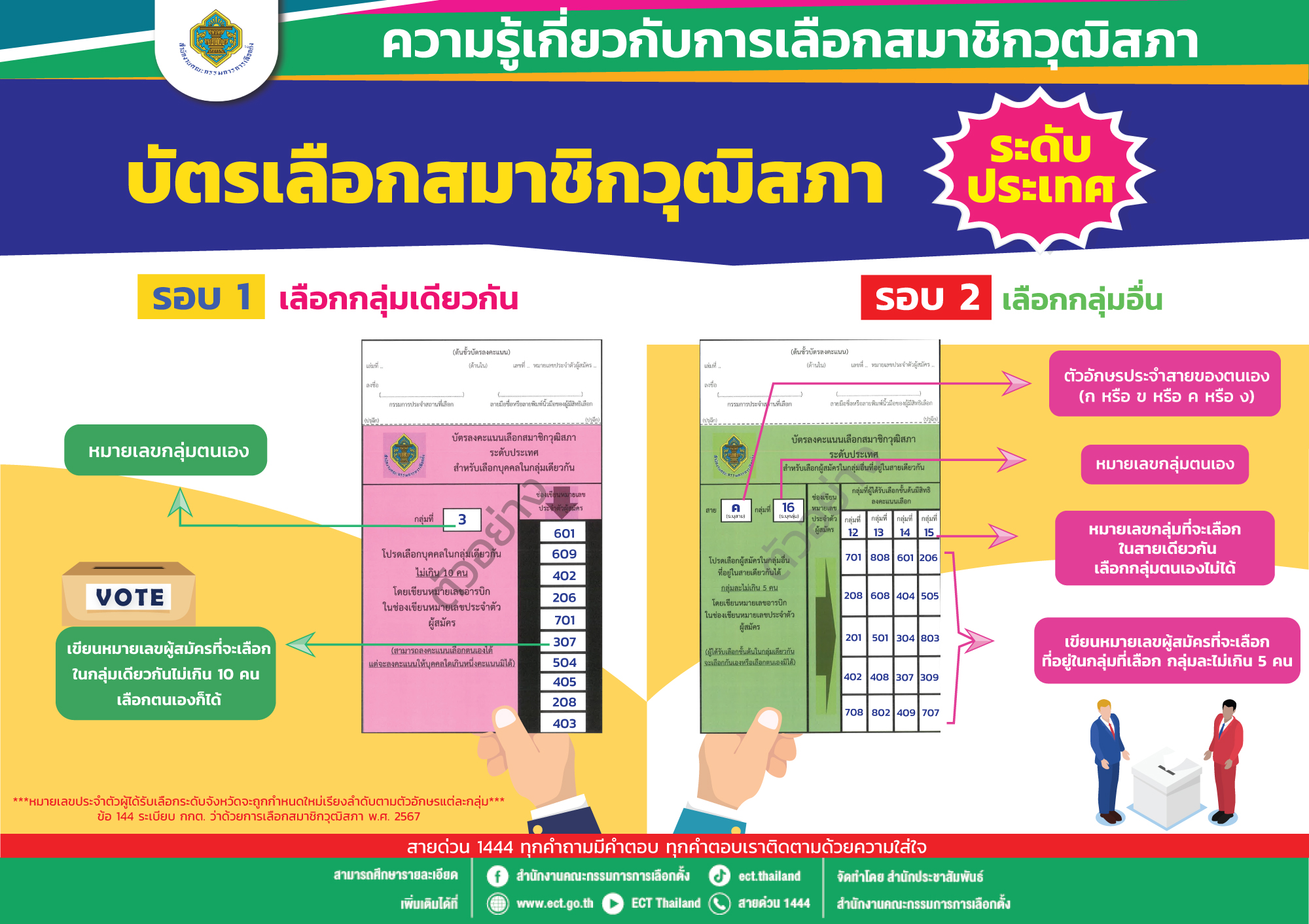 สำนักงานคณะกรรมการการเลือกตั้งแนะนำบัตรเลือกสมาชิกวุฒิสภา ระดับประเทศ ประกอบด้วย 2 รอบ รอบที่ 1 เลือกกลุ่มเดียวกัน หมายเลขกลุ่มตนเอง, เขียนหมายเลขผู้สมัครที่จะเลือกในกลุ่มเดียวกันไม่เกิน 10 คน เลือกตนเองก็ได้ รอบที่ 2 เลือกกลุ่มอื่น ตัวอักษรประจำสายของตนเอง (ก หรือ ข หรือ ค หรือ ง), หมายเลขกลุ่มตนเอง, หมายเลขกลุ่มที่จะเลือก ในสายเดียวกัน เลือกกลุ่มตนเองไม่ได้, เขียนหมายเลขผู้สมัครที่จะเลือก ที่อยู่ในกลุ่มที่เลือก กลุ่มละไม่เกิน 5 คน