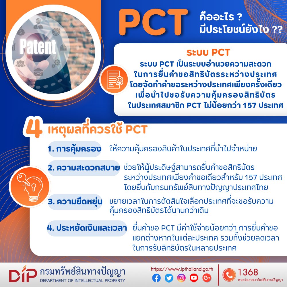ระบบ PCT ระบบ PCT เป็นระบบอำนวยความสะดวกในการยื่นคำขอสิทธิบัตรระหว่างประเทศ โดยจัดทำคำขอระหว่างประเทศเพียงครั้งเดียว เพื่อนำไปขอรับความคุ้มครองสิทธิบัตรในประเทศสมาชิก PCT ไม่น้อยกว่า 157 ประเทศ