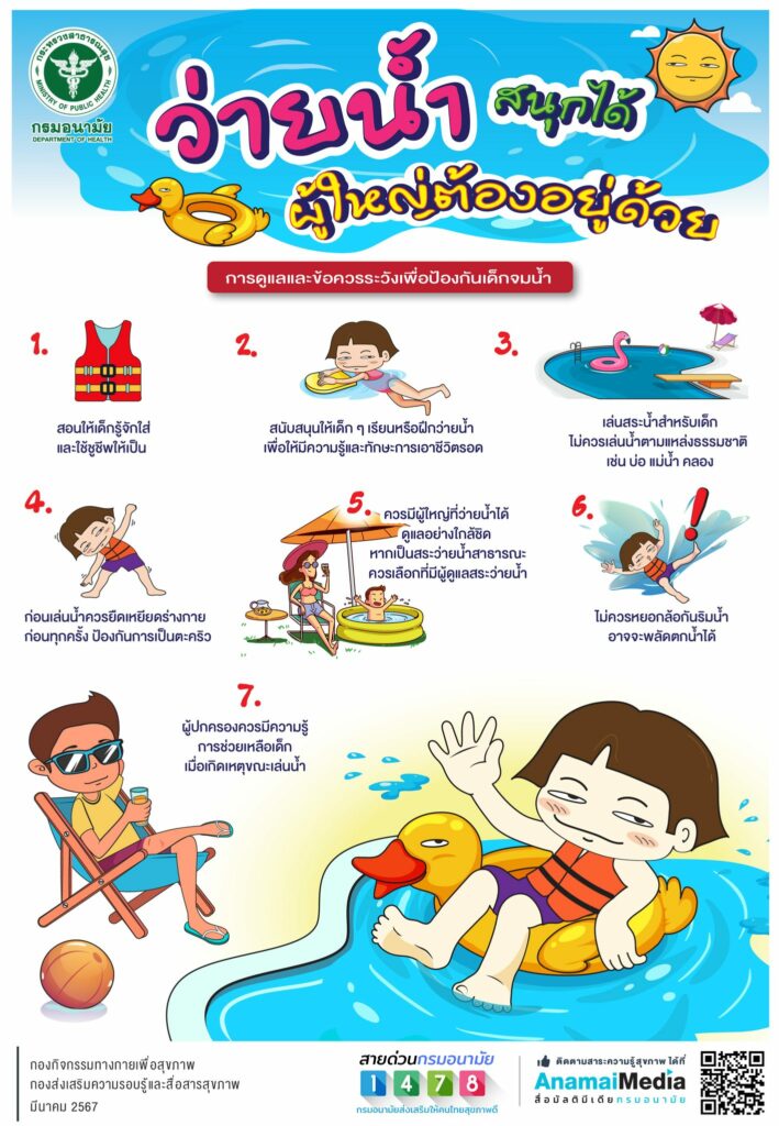 กรมอนามัย แนะนำการดูแลและข้อควรระวังเพื่อป้องกันเด็กจมน้ำ “ว่ายน้ำสนุกได้ ปลอดภัย ผู้ใหญ่ต้องคอยอยู่ดูแลเด็ก ไม่ให้คลาดสายตาด้วย” กิจกรรมช่วงปิดเทอมฤดูร้อน ที่เด็กๆ ชื่นชอบ การเล่นน้ำ ไม่ว่าจะเป็น สระว่ายน้ำ ส่วนน้ำ สถานที่ท่องเที่ยวตามน้ำตก และแหล่งน้ำธรรมชาติ แต่อุบัติเหตุการจมน้ำอันตรายกว่าที่คิด จากความสนุกจะกลายเป็นเรื่องเศร้าทันที เพราะบางรายถึงขั้นเสียชีวิต