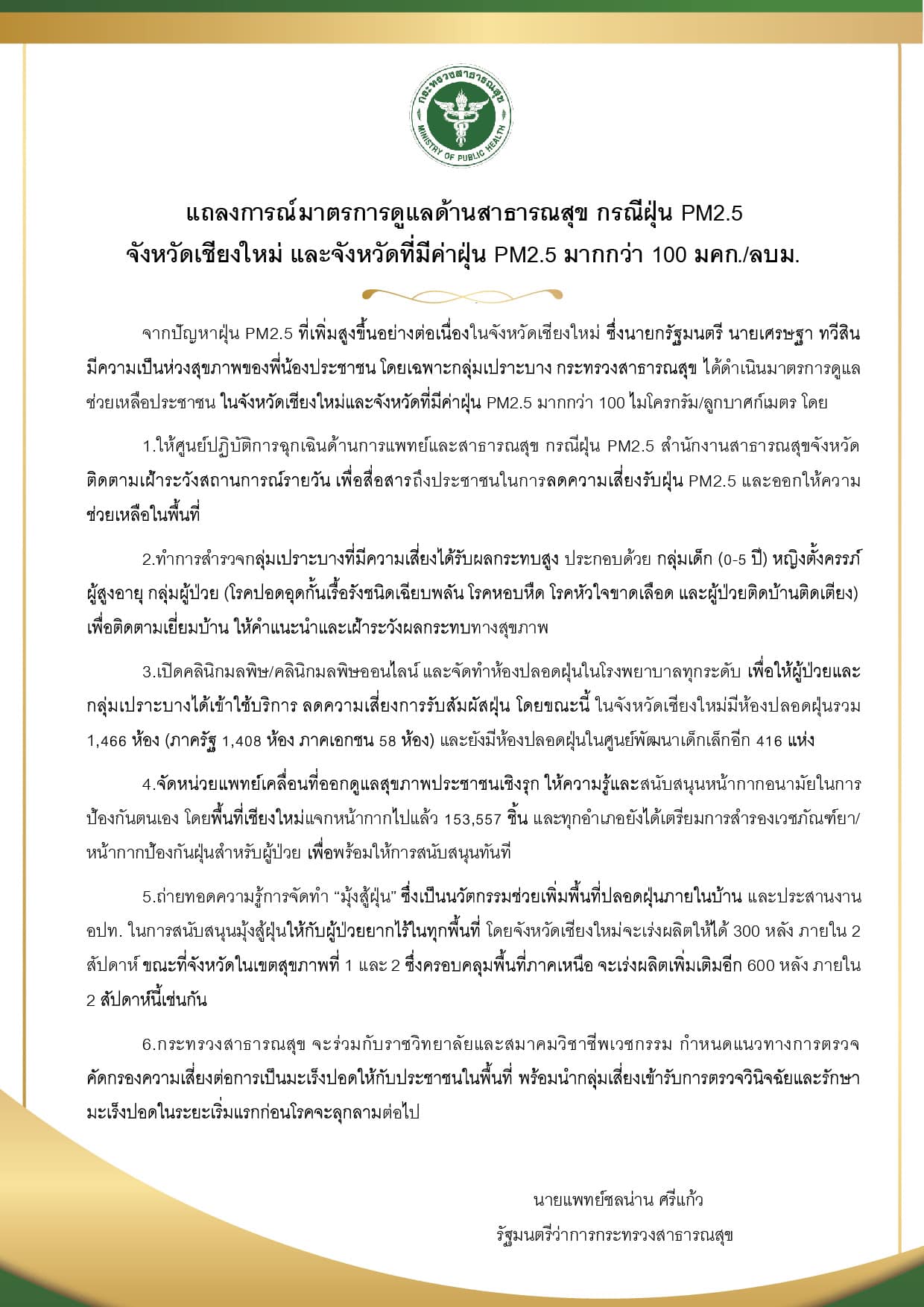 กระทรวงสาธารณสุข ออกแถลงการณ์มาตรการดูแลด้านสาธารณสุข กรณีฝุ่น PM2.5 จังหวัดเชียงใหม่