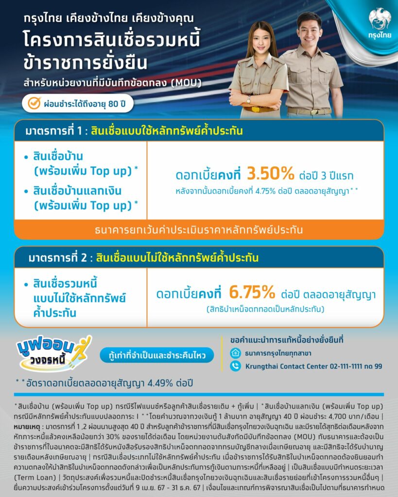 สนใจเข้าร่วมโครงการ “สินเชื่อรวมหนี้ข้าราชการยั่งยืน” ติดต่อได้ที่ธนาคารกรุงไทยทุกสาขา หรือดูเพิ่มเติมได้ที่ https://krungthai.com/link/gov-measures-facebook
