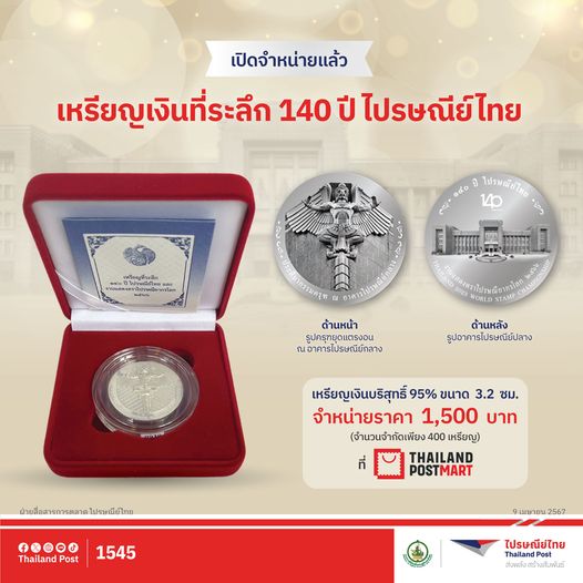 - ไปรษณีย์ไทย เปิดจำหน่าย “เหรียญเงินที่ระลึก 140 ปี ไปรษณีย์ไทย” วาระพิเศษทรงคุณค่า