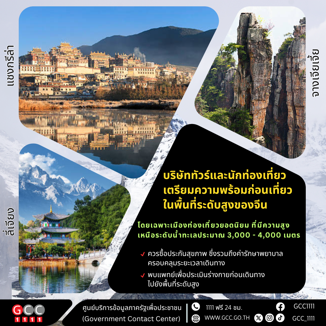 กรมการท่องเที่ยว แจ้งบริษัททัวร์และนักท่องเที่ยวเตรียมความพร้อมของร่างกายก่อนเดินทางท่องเที่ยวในพื้นที่ระดับสูงของจีน โดยเฉพาะเมืองท่องเที่ยวยอดนิยม ที่มีความสูงเหนือระดับน้ำทะเลประมาณ 3,000 – 4,000 เมตร เช่น แชงกรีล่า ลี่เจียง จางเจียเจี้ย โดยนักท่องเที่ยวสามารถเตรียมความพร้อมของร่างกายก่อนการเดินทาง ดังนี้ พบแพทย์เพื่อประเมินร่างกายก่อนเดินทางไปยังพื้นที่ระดับสูง, ควรซื้อประกันสุขภาพ ซึ่งรวมถึงค่ารักษาพยาบาลครอบคลุมระยะเวลาเดินทาง