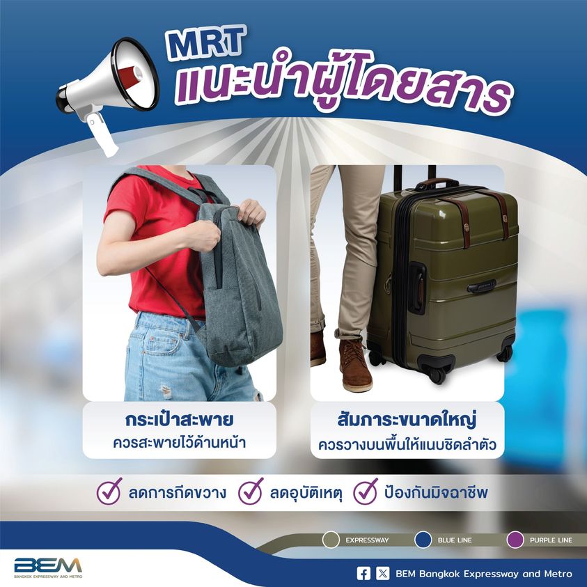 BEM แนะนำข้อควรปฏิบัติผู้โดยสารที่มีกระเป๋าสะพาย หรือสัมภาระขนาดใหญ่ เมื่ออยู่ภายในขบวนรถไฟฟ้า