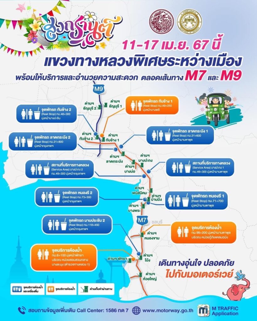 กรมทางหลวง โดยแขวงทางหลวงพิเศษระหว่างเมือง เตรียมพร้อมให้บริการประชาชน บนมอเตอร์เวย์ หมายเลข 7 และ 9 เพื่อให้บริการประชาชนที่เดินทางกลับภูมิลำเนา และเดินทางท่องเที่ยวในวันหยุดยาวช่วงเทศกาลสงกรานต์ โดยได้เตรียมความพร้อมจัดตั้งจุดให้บริการทั่วไทย และจุดบริการห้องน้ำสะอาด ระหว่างวันที่ 11 – 17 เมษายน 2567 จำนวน 8 จุดบริการทั่วไทย และ 3 จุดห้องน้ำสะอาด