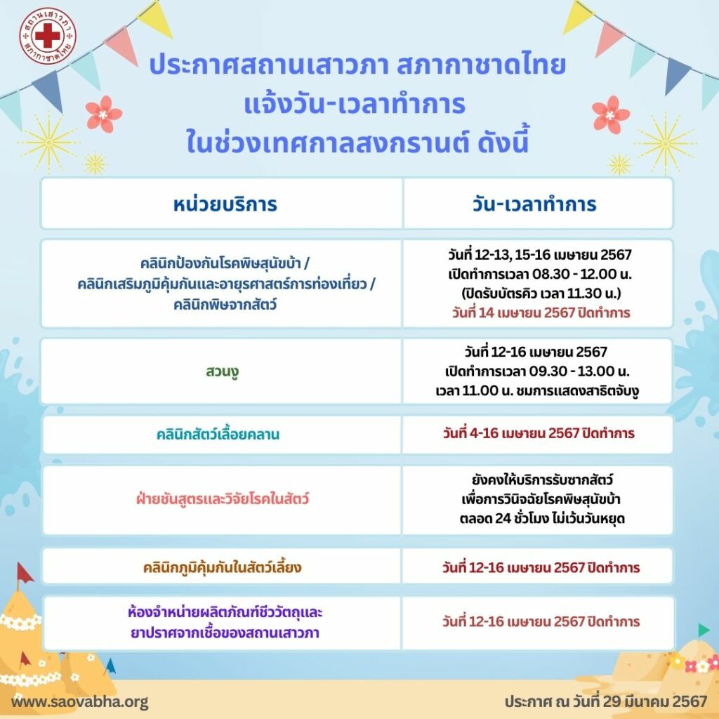 สถานเสาวภา สภากาชาดไทย แจ้งวัน – เวลาทำการ ในช่วงเทศกาลสงกรานต์ ดังนี้