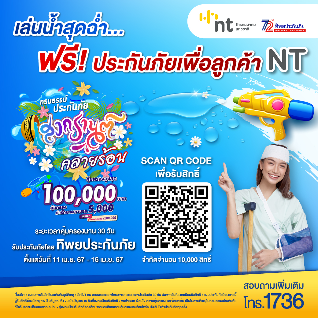 สงกรานต์อุ่นใจ..เล่นน้ำสุดฉ่ำ NT ร่วมกับ ทิพยประกันภัย มอบกรมธรรม์ประกันภัย สงกรานต์คลายร้อน ฟรี โดย NT ร่วมกับ ทิพยประกันภัย ส่งความสุขมอบความห่วงใยตลอดเทศกาลสงกรานต์ ให้กับลูกค้า พนักงานและครอบครัว NT ที่มีอายุ 15 – 70 ปี เดินทางและท่องเที่ยวอย่างอุ่นใจ ด้วยประกันภัยอุบัติเหตุสูงสุด 100,000 บาท และคุ้มครองค่ารักษาพยาบาล 5,000 บาท (รายละเอียดตามเงื่อนไขกรมธรรม์)