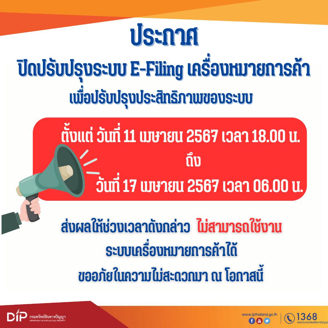 กรมทรัพย์สินทางปัญญา แจ้งปิดปรับปรุงระบบ E-Filing เครื่องหมายการค้าเพื่อปรับรุงประสิทธิภาพของระบบ ตั้งแต่ วันที่ 11 เมษายน 2567 เวลา 18.00 น. – วันที่ 17 เมษายน 2567 เวลา 06.00 น. ส่งผลให้ช่วงเวลาดังกล่าว ไม่สามารถใช้งานระบบเครื่องหมายการค้าได้