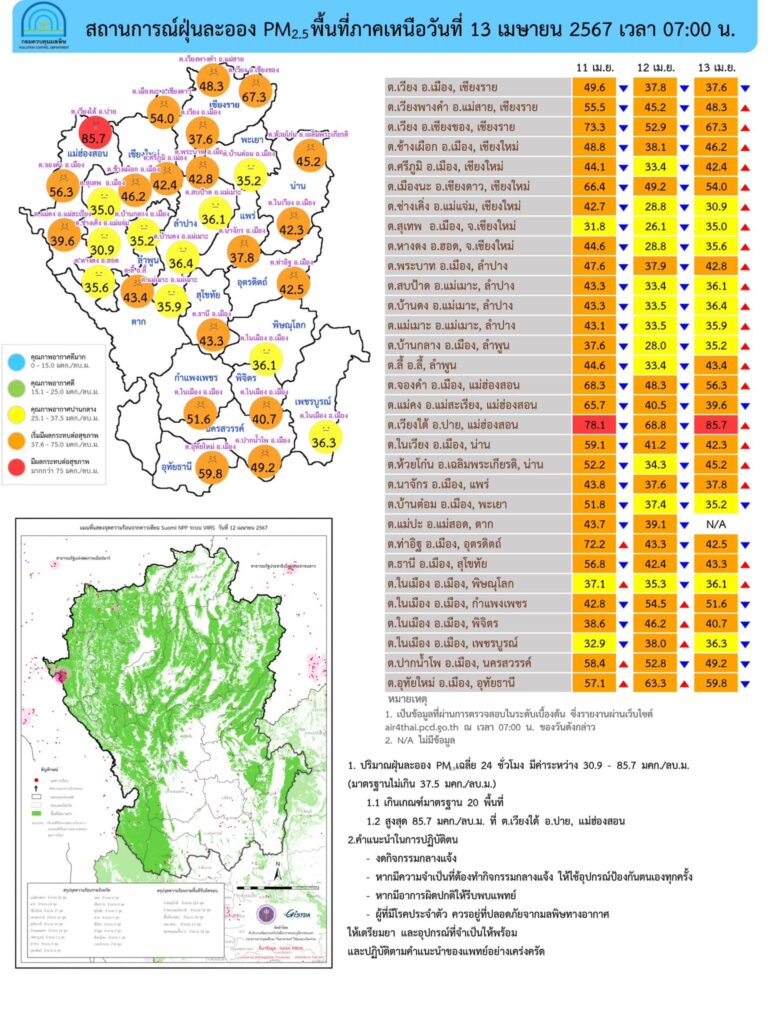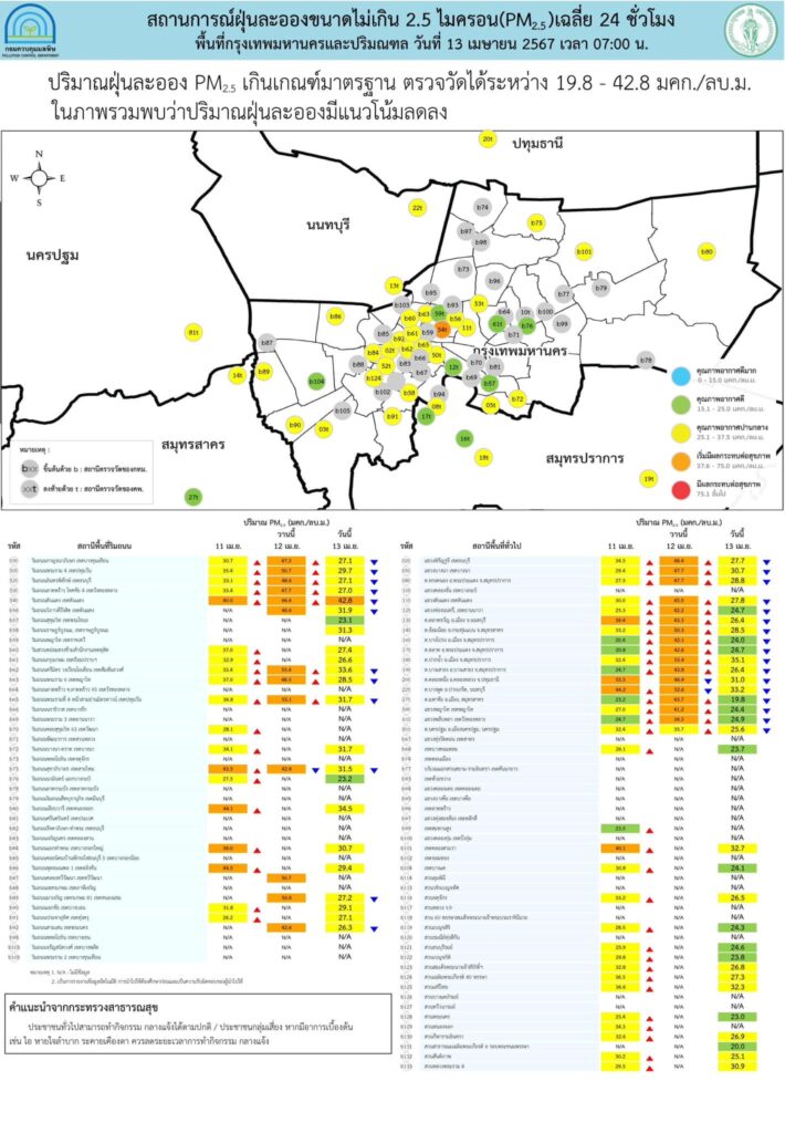 ศูนย์สื่อสารการแก้ไขปัญหามลพิษทางอากาศ รายงานการติดตามตรวจสอบคุณภาพอากาศ ประจำวันที่ 13 เมษายน 2567 ณ 07:00
