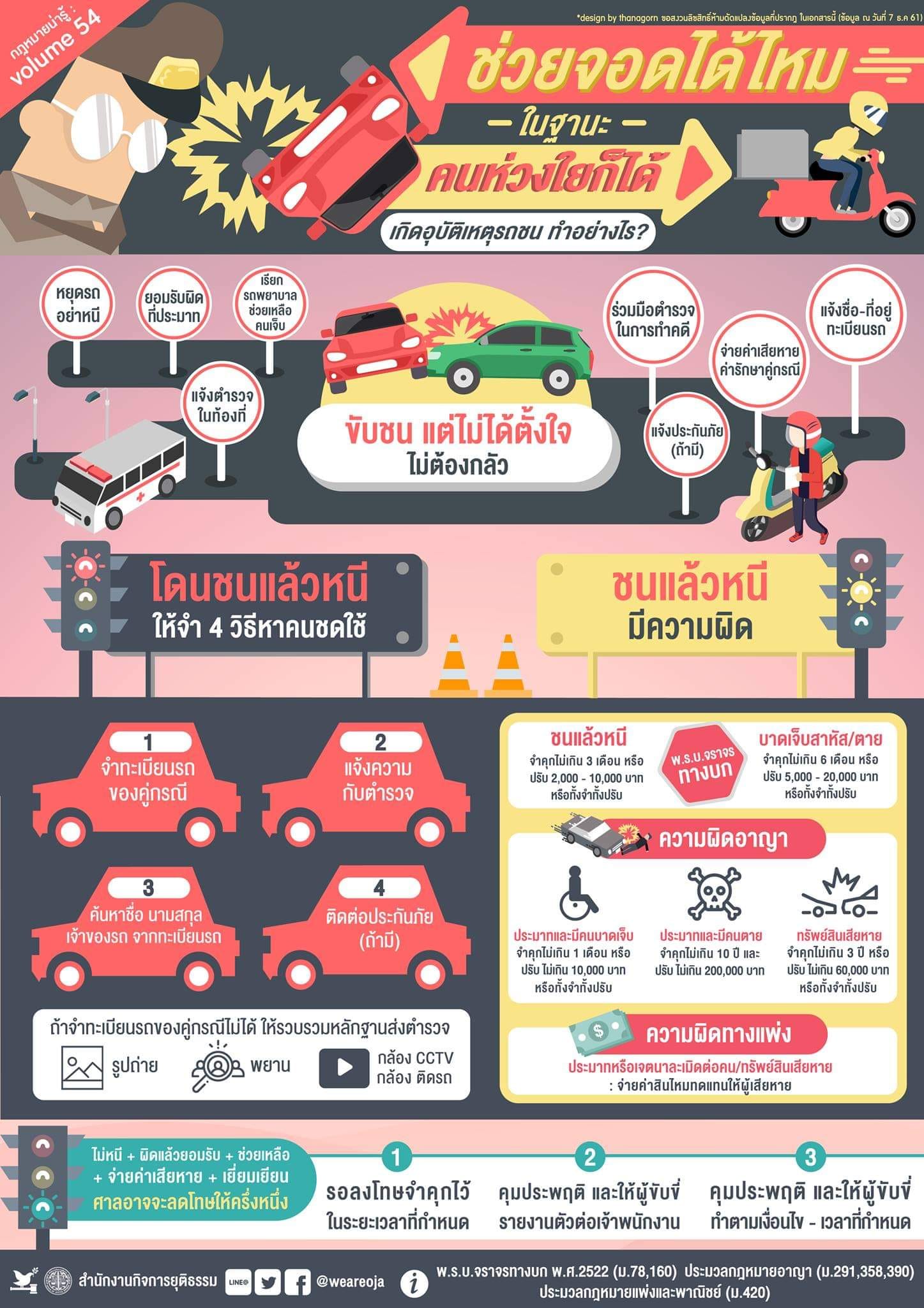 สำนักงานกิจการยุติธรรม แนะนำช่วยจอดได้ไหม ในฐานะ คนห่วงใยก็ได้ เกิดอุบัติเหตุรถชน ทำอย่างไร ดังนี้ ขับรถชนกันแบบไม่ได้ตั้งใจ ไม่ต้องกลัว ทำ 8 วิธีง่าย ๆ คลี่คลายปัญหาได้, ฝ่ายที่ถูกชน แต่คู่กรณีหนีไปทำ 4 วิธีง่าย ๆ หาคนชดใช้ค่าเสียหายและรับผิดได้แน่นอน, ถ้าคุณจำทะเบียนรถไม่ได้ ไม่เป็นไร ให้