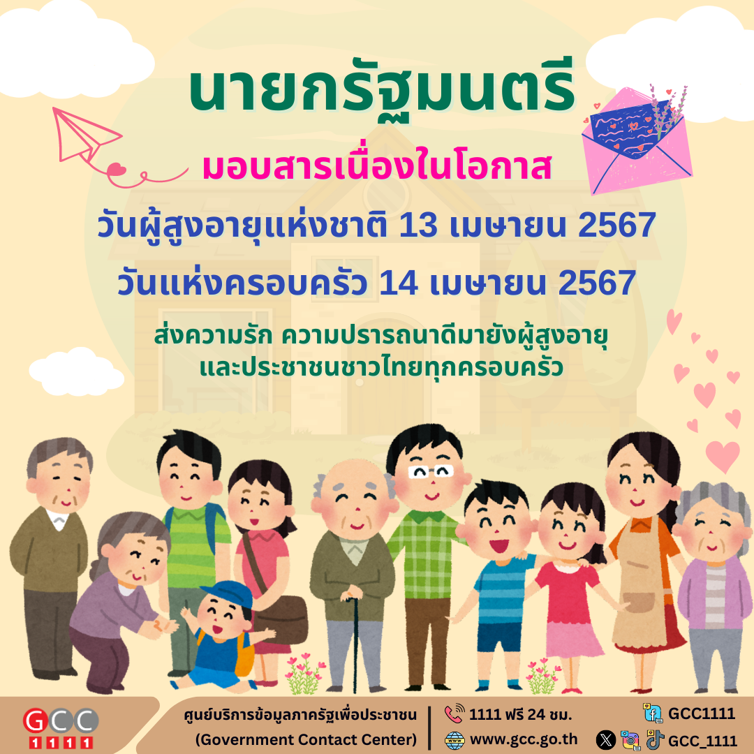 นายกรัฐมนตรี มอบสารเนื่องในโอกาส “วันผู้สูงอายุแห่งชาติ” 13 เมษายน 2567 และ “วันแห่งครอบครัว” วันที่ 14 เมษายน 2567 ส่งความรัก ความระลึกถึง ความปรารถนาดีมายังผู้สูงอายุทุกคน และพี่น้องประชาชนชาวไทยทุกครอบครัว