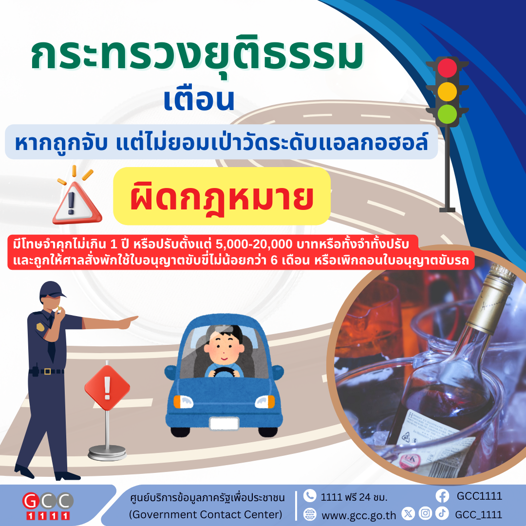 กระทรวงยุติธรรม เตือนหากถูกจับแต่ไม่ยอมเป่าวัดระดับแอลกอฮอล์ ผิดกฎหมาย ข่าวสารกิจกรรม กระทรวงยุติธรรม เตือนหากถูกจับแต่ไม่ยอมเป่าวัดระดับแอลกอฮอล์ ผิดกฎหมาย กระทรวงยุติธรรม แนะนำข้อความรู้ หากถูกจับ แต่ไม่ยอมเป่าวัดระดับแอลกอฮอล์ จะผิดกฎหมายหรือไม่ตอบ : ในกรณีที่ไม่เป่าแอลกอฮอล์ ในทางกฎหมายจะถือว่าเมาแล้วขับ ต้องระวางโทษ จำคุกไม่เกิน 1 ปี หรือปรับตั้งแต่ 5,000-20,000 บาท หรือทั้งจำทั้งปรับ และถูกให้ศาลสั่งพักใช้ใบอนุญาตขับขี่ไม่น้อยกว่า 6 เดือน หรือเพิกถอนใบอนุญาตขับรถ ที่มา : https://bit.ly/49BKrVZ Post Views: 39 FacebookFacebookXTwitterLINELine