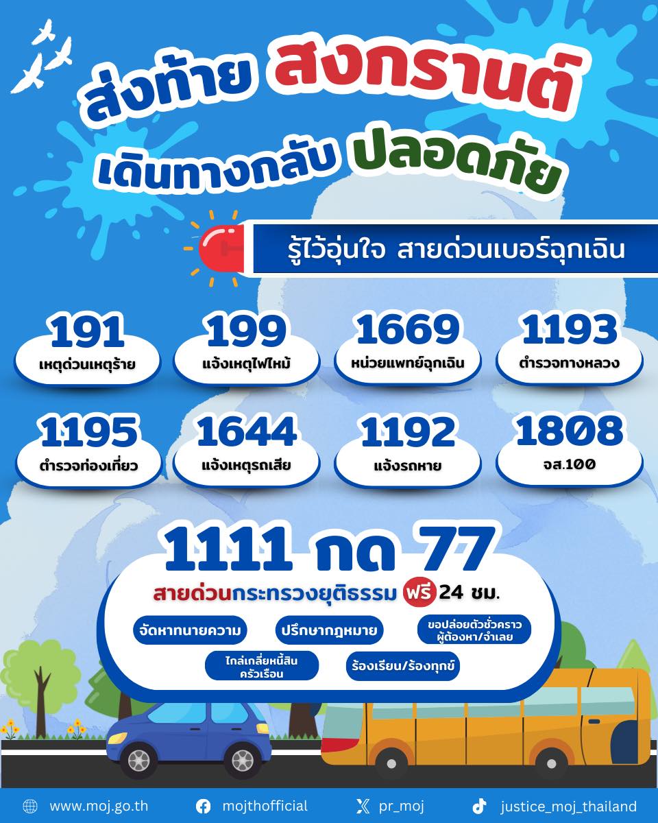 กระทรวงยุติธรรม ส่งท้ายสงกรานต์ เดินทางกลับปลอดภัย รู้ไว้อุ่นใจสายด่วนเบอร์ฉุกเฉิน