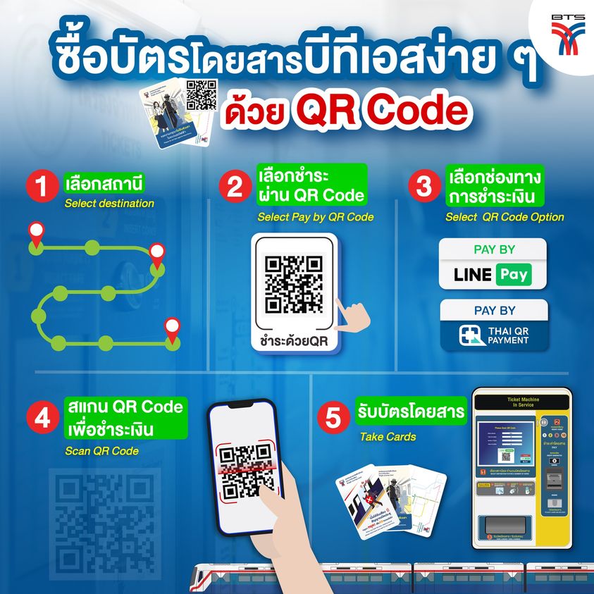 รถไฟฟ้าบีทีเอส แนะนำซื้อตั๋วโดยสารด้วย QR Code รองรับทั้ง LINE Pay และแอปธนาคาร โดยใช้ในการซื้อตั๋วโดยสารที่ตู้จำหน่ายตั๋ว และสามารถซื้อได้ครั้งละหลายใบ หากมีแอปไลน์ ที่สมัคร LINE Pay อยู่แล้ว สามารถกดสแกนแล้วเลือกชำระเงินได้เลย หากมีแอปธนาคารก็เลือก THAI QR PAYMENT ปุ่มสีฟ้า เปิดแอปธนาคาร แล้วนำมาสแกนกับสัญลักษณ์ THAI QR PAYMENT ทำรายการโอนเงินที่แอปธนาคารบนมือถือ หรือซื้อตั๋วโดยสารเที่ยวเดียวได้ที่ห้องจำหน่ายตั๋วโดยสาร โดยไม่ต้องแลกเหรียญแล้วนำมาซื้อที่เครื่องจำหน่ายตั๋วอัตโนมัติ สอบถามเรื่องการเดินทางได้ที่ @btsskytrain หรือ คลิก bit.ly/2TUzZXH