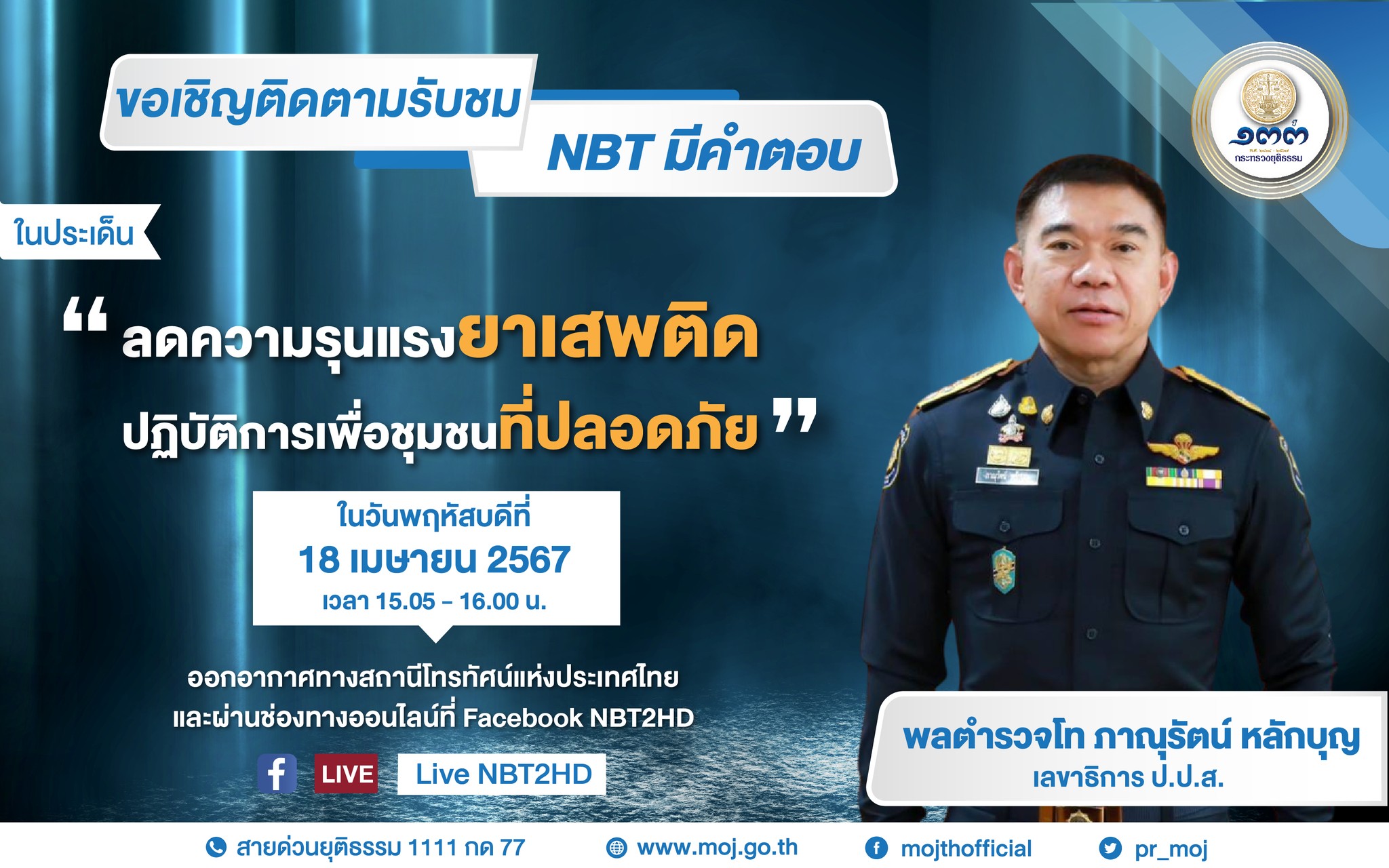 กระทรวงยุติธรรม จัดรายการ NBT มีคำตอบ ในประเด็น “ลดความรุนแรงยาเสพติด ปฏิบัติการเพื่อชุมชนที่ปลอดภัย” วันที่ 18 เมษายน 2567 เวลา 15.05 – 16.00 น. ผ่านช่องทาง รายการ NBT มีคำตอบ ทางสถานีวิทยุโทรทัศน์แห่งประเทศไทย NBT