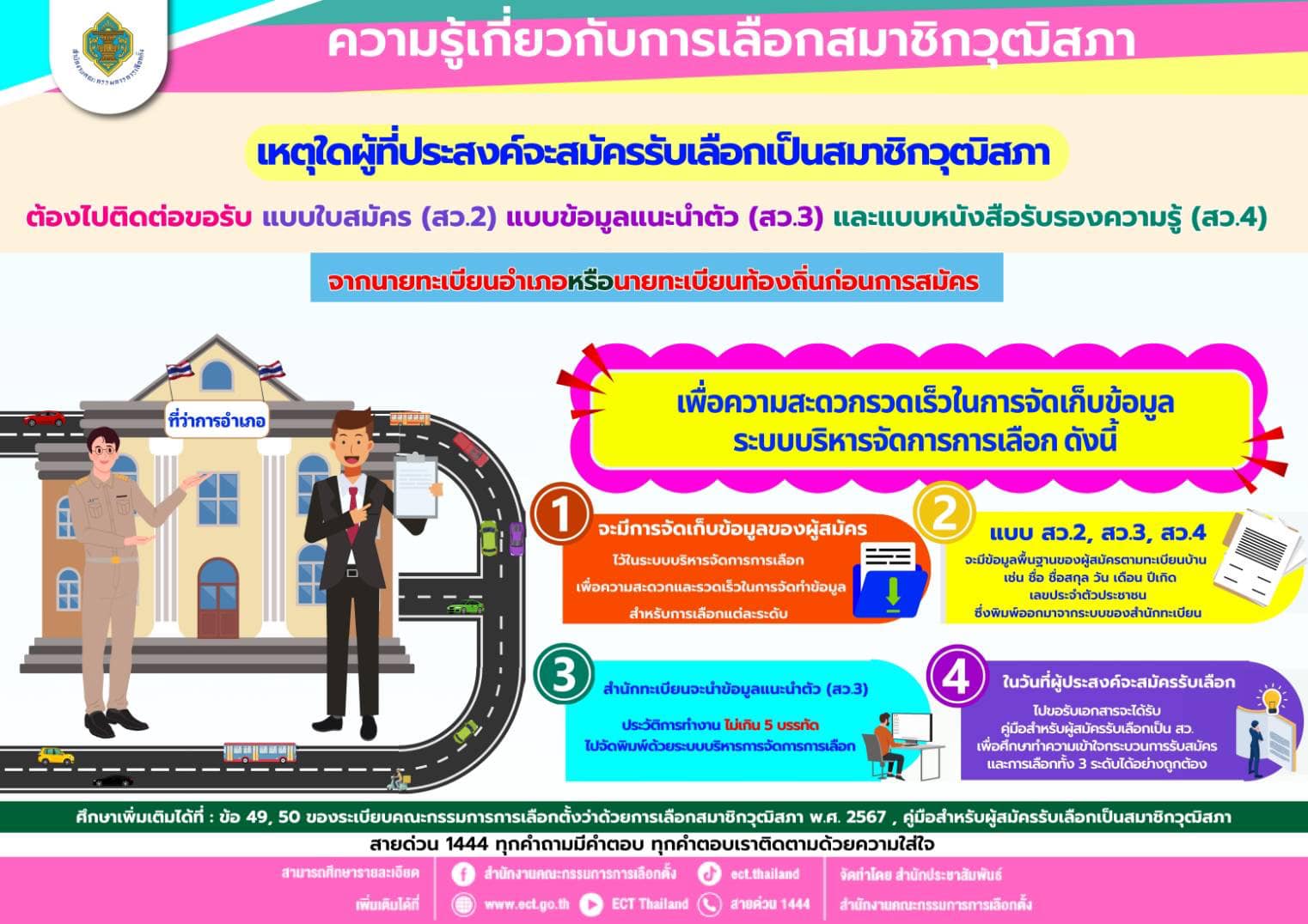 - สํานักทะเบียนจะน่าข้อมูลแนะนําตัว (สว.3) ประวัติการทำงาน ไม่เกิน 5 บรรทัด ไปอัดพิมพ์ด้วยระบบบริหารการจัดการการเลือก