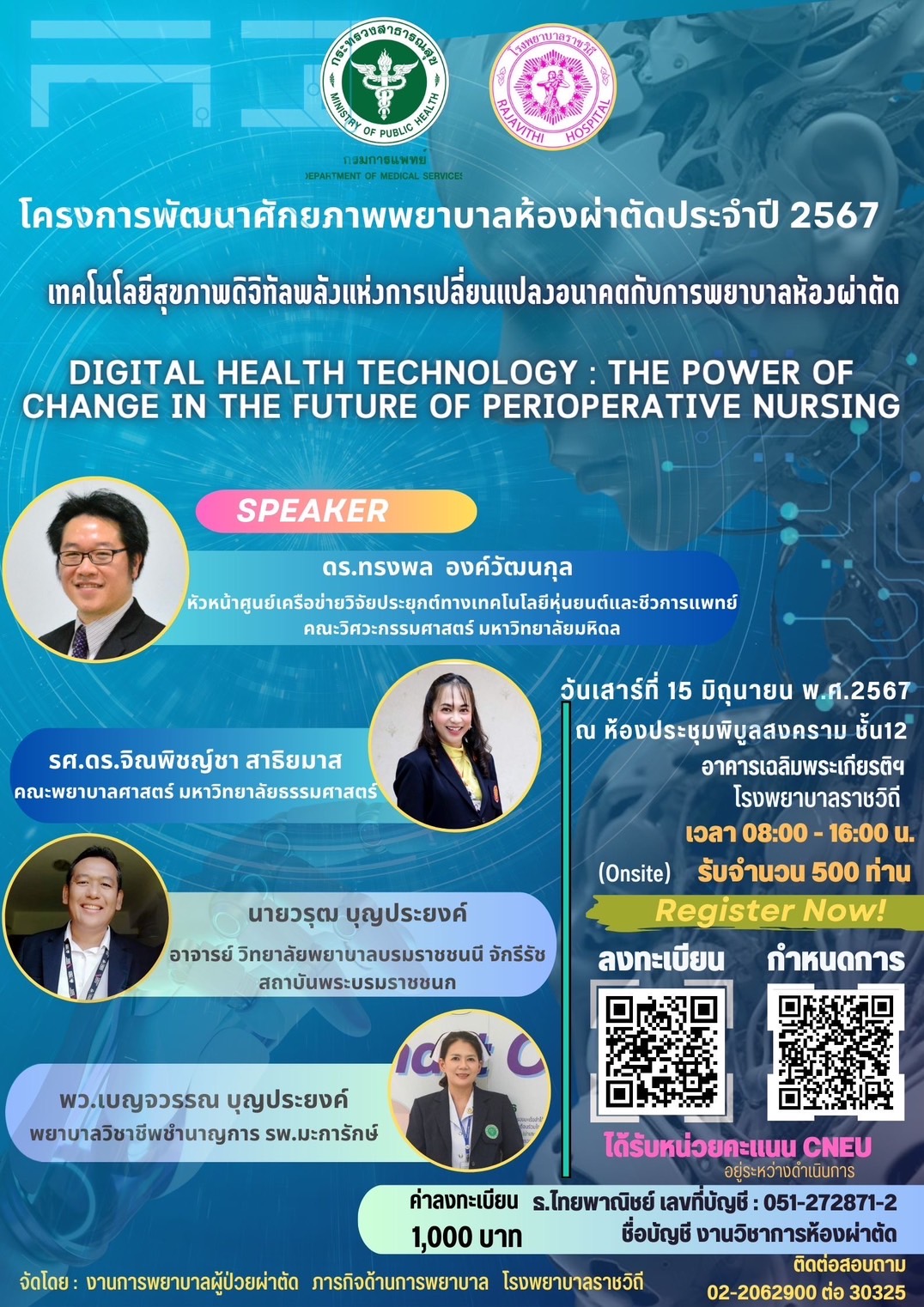 โรงพยาบาลราชวิถี จัดงานประชุมวิชาการ โครงการพัฒนาศักยภาพพยาบาลห้องผ่าตัด ประจำปี 2567 ในหัวข้อ เทคโนโลยีสุขภาพดิจิทัลพลังแห่งการปลี่ยนแปลงอนาคตกับการพยาบาลห้องผ่าตัด วันที่ 15 มิถุนายน 2567 ณ ห้องประชุมพิบูลสงคราม ชั้น 12 อาคารเฉลิมพระเกียรติฯ โรงพยาบาลราชวิถี ผู้ที่สนใจสามารถลงทะเบียน ตั้งแต่บัดนี้ – 5 มิถุนายน 2567 ได้ที่ https://shorturl.asia/DtX2y (มีค่าลงทะเบียน 1,000 บาท)
