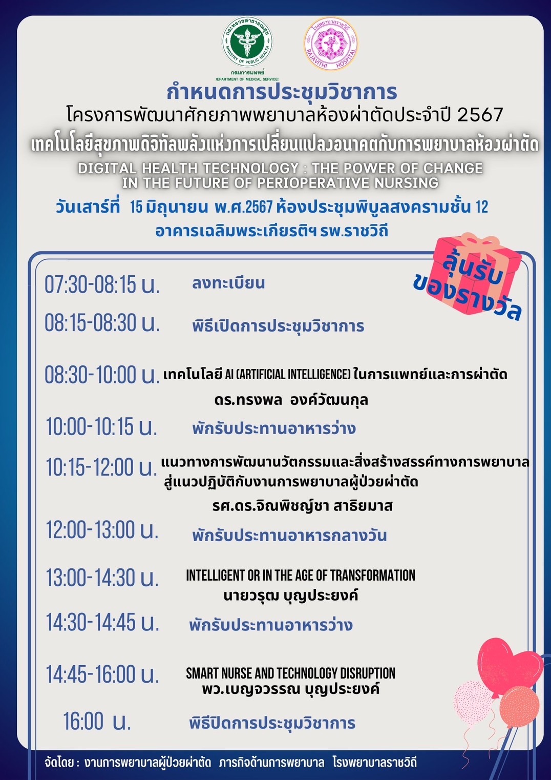 โรงพยาบาลราชวิถี โดย งานการพยาบาลผู้ป่วยผ่าตัด กลุ่มงานการพยาบาลผู้ป่วยใน ภารกิจด้านการพยาบาล ขอเชิญเข้าร่วมงานประชุมวิชาการ โครงการพัฒนาศักยภาพพยาบาลห้องผ่าตัด ประจำปี 2567 ในหัวข้อ เทคโนโลยีสุขภาพดิจิทัลพลังแห่งการปลี่ยนแปลงอนาคตกับการพยาบาลห้องผ่าตัด (Digital Health Technology : The Power of change in the future of perioperative nursing) วันเสาร์ที่ 15 มิถุนายน 2567 ณ ห้องประชุมพิบูลสงคราม ชั้น 12 อาคารเฉลิมพระเกียรติฯ โรงพยาบาลราชวิถี (ผู้เข้ารับการอบรมจะได้รับหน่วยคะแนน CNEU ด้วย),