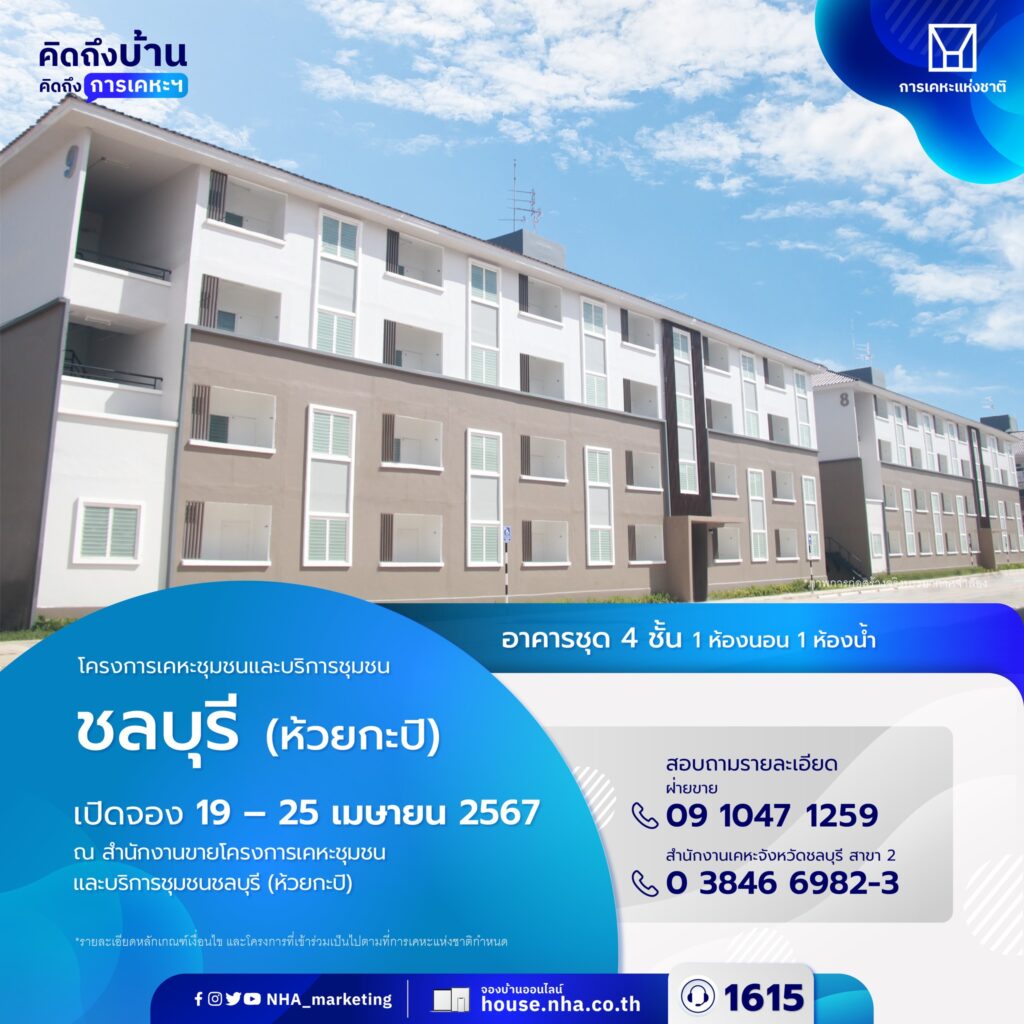 การเคหะแห่งชาติ สนับสนุนการมีบ้านของคนไทย เปิดจองโครงการบ้านเอื้ออาทร จังหวัดชลบุรี (ห้วยกะปิ) อาคารชุดพักอาศัย 4 ชั้น ใกล้ถนนสุขุมวิท เชื่อมต่อถนนข้าวหลาม ออกสู่ถนนมอเตอร์เวย์ชลบุรี – พัทยา ใกล้บิ๊กซี อินเด็กซ์ ลิฟวิ่งมอลล์ แม็คโคร โฮมโปร และตลาดหนองมน จองเริ่มต้นเพียง 1,000 บาท หมายเหตุ : **รายละเอียดหลักเกณฑ์เงื่อนไข และโครงการที่เข้าร่วม เป็นไปตามที่การเคหะแห่งชาติกำหนด** เปิดจองระหว่างวันที่ 19 – 25 เมษายน 2567 ณ อาคาร 1 โครงการเคหะชุมชนและบริการชุมชนชลบุรี (ห้วยกะปิ)