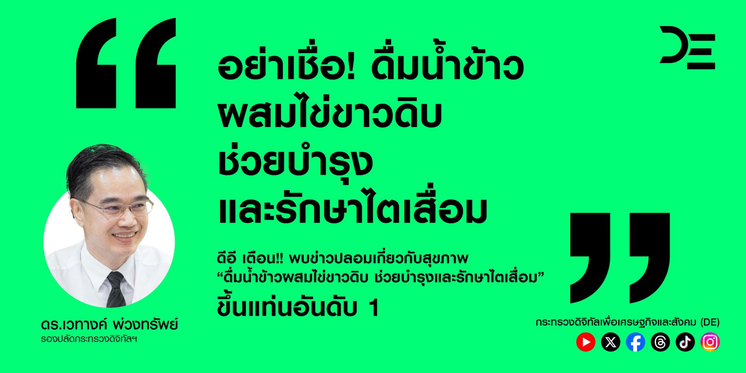 กระทรวงดิจิทัลเพื่อเศรษฐกิจและสังคม (ดีอี) พบข่าวปลอมเกี่ยวกับสุขภาพ “ดื่มน้ำข้าวผสมไข่ขาวดิบ ช่วยบำรุงและรักษาไตเสื่อม” ขึ้นแท่นอันดับ 1 รองลงมาเป็น “สำนักงานสลากกินแบ่งรัฐบาล เผยเลขลับเฉพาะวงในทุกงวด” และ “ผมร่วงและปวดหลังเป็นอาการของโรคออฟฟิศซินโดรม” เตือนประชาชนตรวจสอบข้อมูลให้รอบด้าน เช็คให้ชัวร์ ก่อนแชร์ ระวังมิจฉาชีพหลอกให้โอนเงินและล้วงเอาข้อมูลสำคัญ