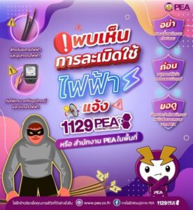 PEA ตรวจพบว่ามีกลุ่มมิจฉาชีพบางกลุ่มอ้างว่าสามารถดัดแปลงมิเตอร์ ต่อไฟตรงโดยไม่ผ่านมิเตอร์ หรือแก้ไขอุปกรณ์ไฟฟ้า โดยทำให้หน่วยการใช้กระแสไฟฟ้าลดลงและทำให้เสียค่าไฟฟ้าน้อยลง PEA ขอเตือนผู้ใช้ไฟฟ้าอย่าหลงเชื่อเพราะนอกจากต้องเสียค่าใช้จ่ายเพิ่มแล้ว ยังต้องชดใช้ค่าปรับค่าเสียหายตลอดจนเสียค่าใช้จ่ายอื่นๆ และถูกดำเนินคดีทั้งทางแพ่งและอาญา