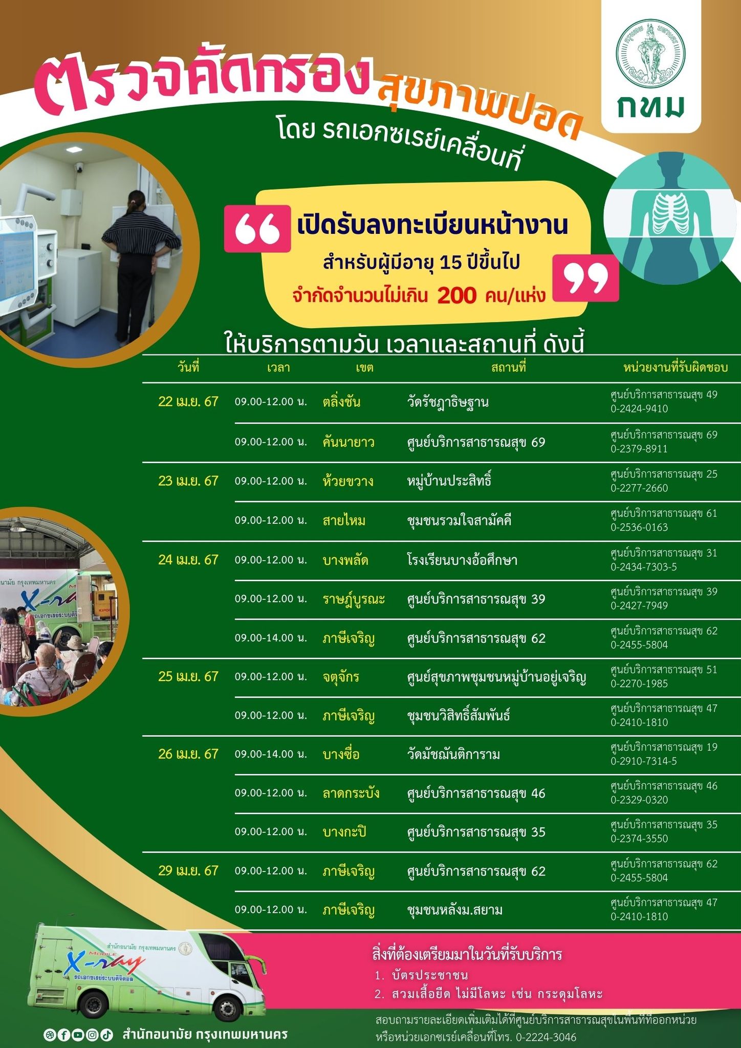 กรุงเทพมหานคร ให้บริการตรวจคัดกรองสุขภาพปอดโดยรถเอกซเรย์เคลื่อนที่ วันที่ 22 – 29 เมษายน 2567 เปิดรับลงทะเบียนหน้างาน สำหรับผู้ที่มีอายุ 15 ปีขึ้นไป จำกัดจำนวนไม่เกิน 200 คน/แห่ง ให้บริการตามวันและสถานที่ ดังนี้
